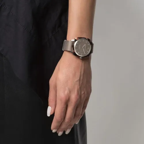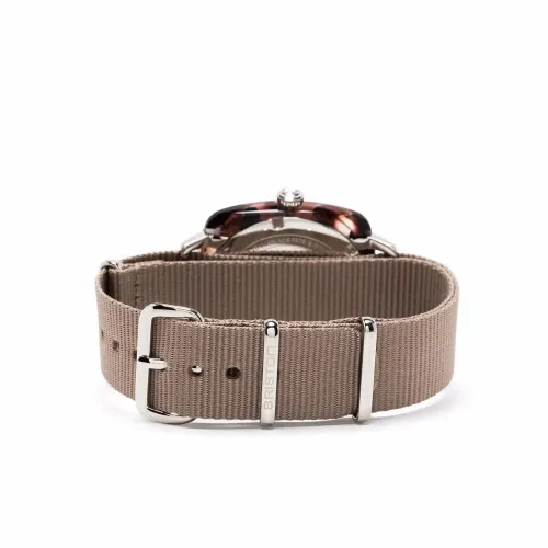 Круглый корпус, кварцевый механизм, тканевый ремешок, мечевидные стрелки, куполообразное сапфировое стекло и водонепроницаемость до 100 метров/10 АТМ.