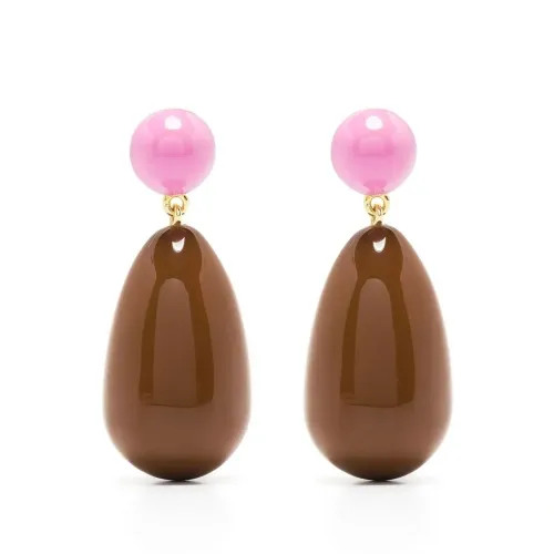Ярко-розовый, коричневый, деталь из эмали, серьги-подвески и застежка-штифт. В комплект входят две серьги.