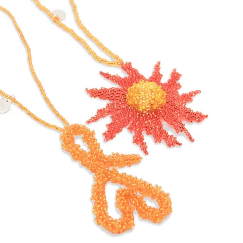 набор из двух стеклянных бусин серебристого и оранжевого цвета: подвеска-цветок и подвеска-сердце. Изделие поставляется в фирменном защитном мешочке.