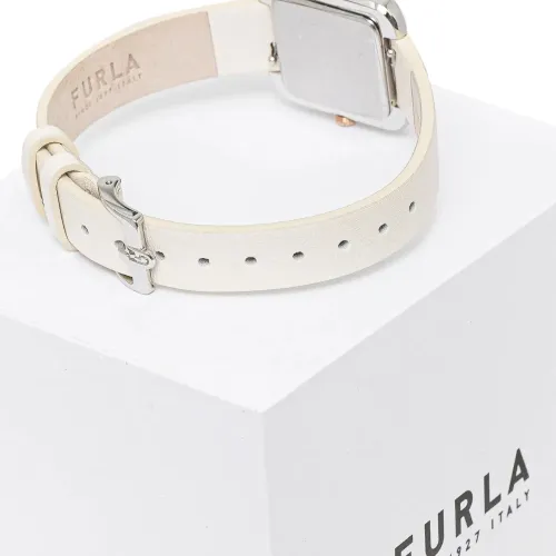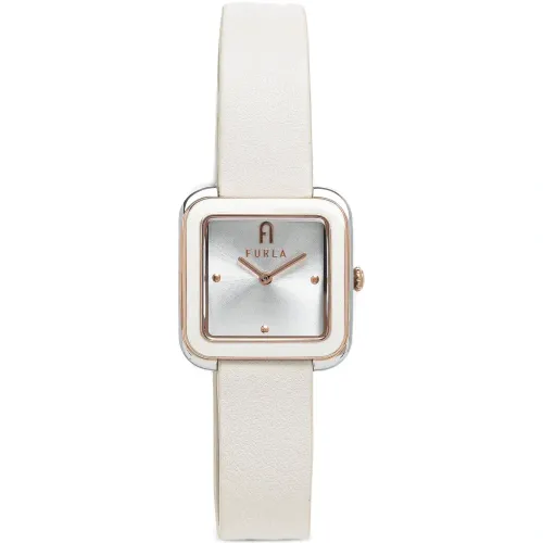 белый квадратный корпус, серебристый циферблат, две стрелки, корпус с акцентом цвета розового золота, кожаный ремешок, стандартная заводная головка