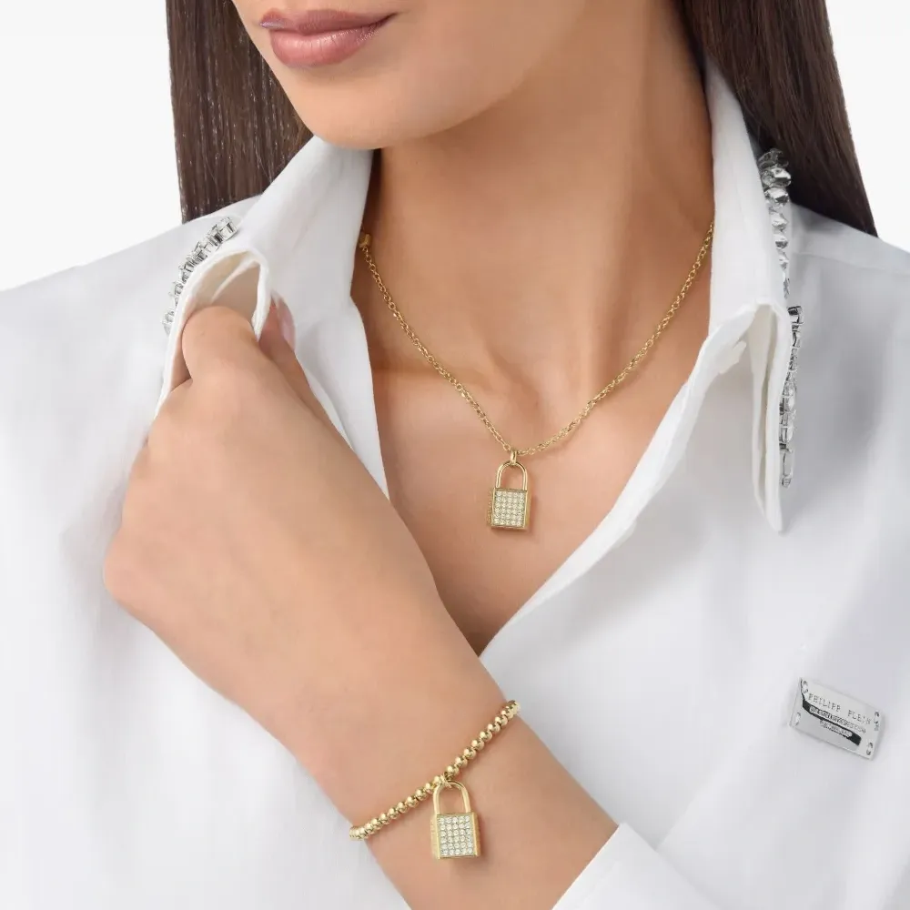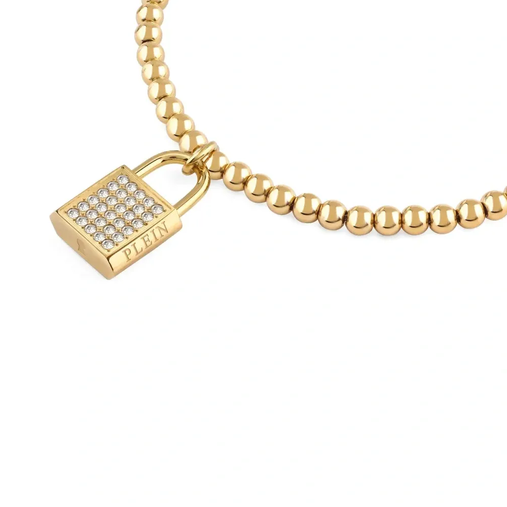 цепочка с золотистым покрытием, бусинами, кристаллами, подвеской-замочком, застежкой-карабином. Обычное ежедневное использование и воздействие внешних факторов могут уменьшить блеск драгоценных камней и золотых поверхностей. Для ухода используйте специальные неабразивные средства, предназначенные для чистки ювелирных изделий.