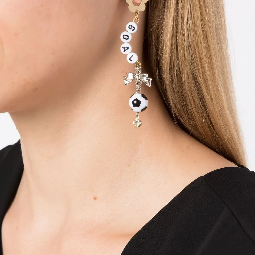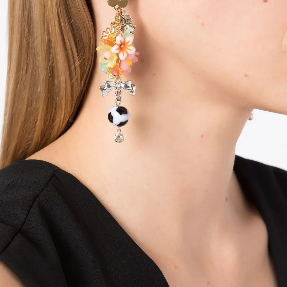 Разноцветный, металл, детали из бисера, цветочная аппликация, подвеска с буквой и застежка-бабочка. Правая и левая серьга различаются — это часть дизайна.