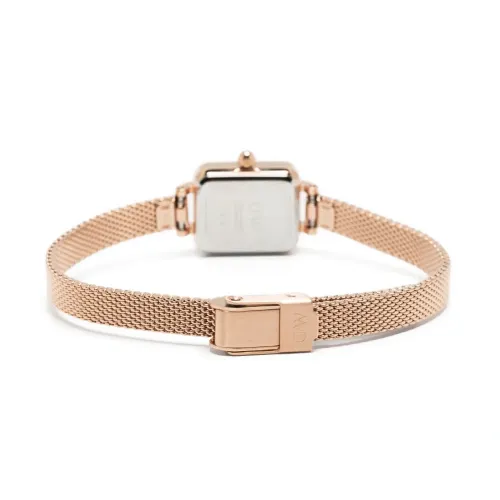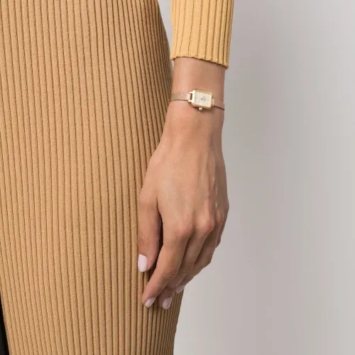 Розовое золото, нержавеющая сталь, прямоугольный корпус, циферблат с индексами, прямоугольные вытянутые стрелки, завинчивающаяся заводная коронка, плетеный браслет, застежка на зажиме и кварцевый механизм. На этот товар распространяется стандартная годовая гарантия от бутика.