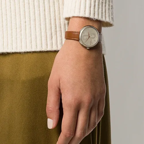 Круглый корпус, минеральное стекло, циферблат с индексами, кожаный ремешок и застежка на пряжке.