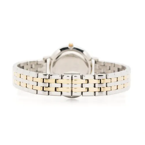 Золотистый, нержавеющая сталь, кварцевый механизм, хрустальные часовые индексы, тонкие закругленные стрелки, круглый корпус, двухцветный браслет, потайная застежка, завинчивающаяся заводная коронка и водонепроницаемость до 30 метров/3 АТМ. На этот товар распространяется стандартная двухлетняя гарантия от производителя.