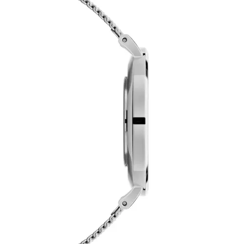 Серебристый, молочный, нержавеющая сталь, тонкие закругленные стрелки, кварцевый механизм, круглый корпус, плетеный браслет и раскладная застежка.