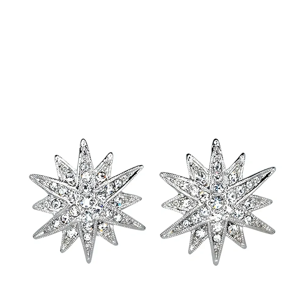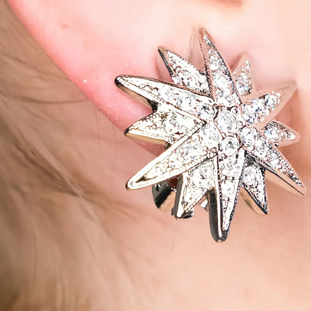 серебристый оттенок, украшение кристаллами, форма звезды. Эти серьги идут в паре.