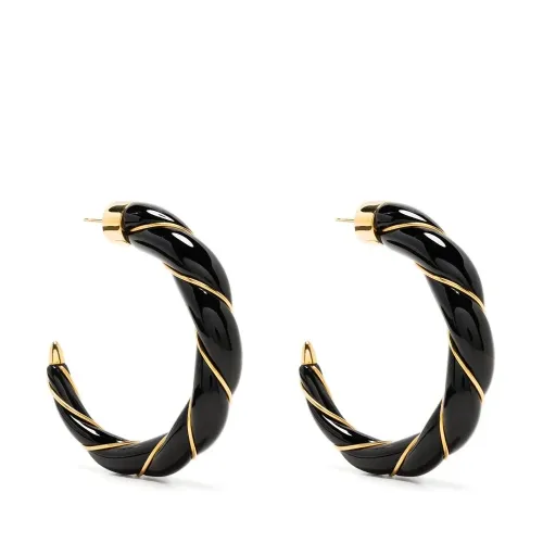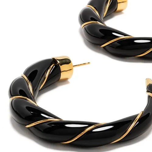 Черный, золотистый, перекрученная деталь, полукруглая форма и застежка на кнопках. В комплект входят две серьги.