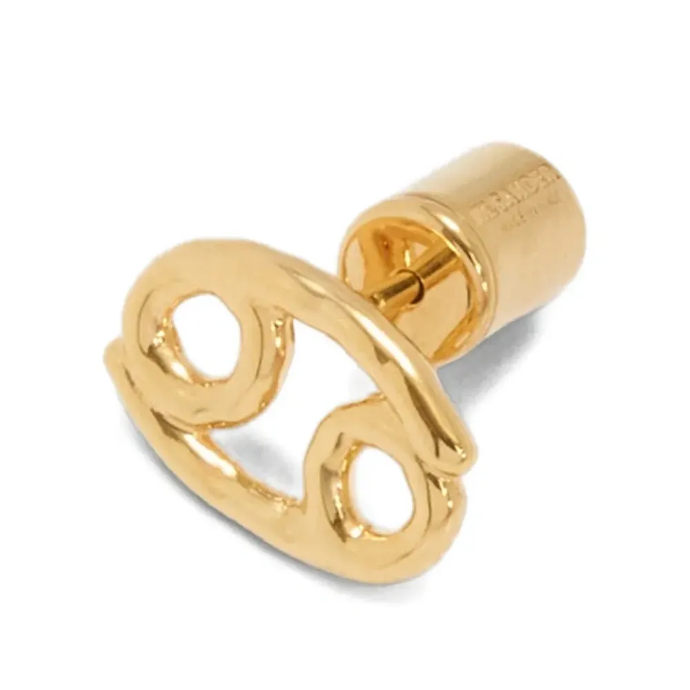 Серьга золотистого цвета с гравировкой знака зодиака и логотипом, застёжка-гвоздик. Это одиночная серьга. Все изделия изготовлены вручную.