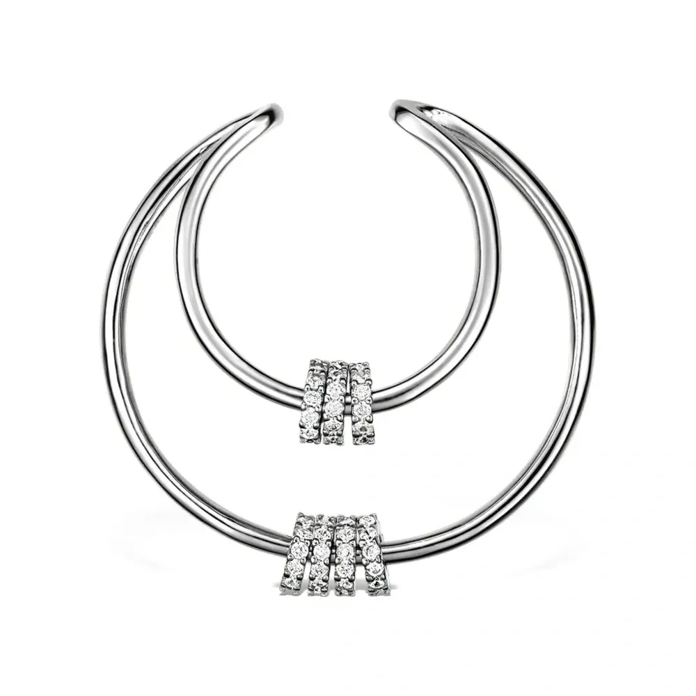 Серьга из металла серебристого оттенка, с дизайном в виде кольца, украшенная камнями, с покрытием. Это одиночная серьга.