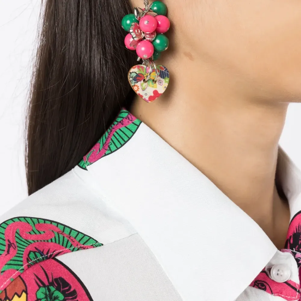 Разноцветный, подвеска в форме сердца, серьги-подвески и для проколотых ушей. Правая и левая серьга различаются — это часть дизайна.