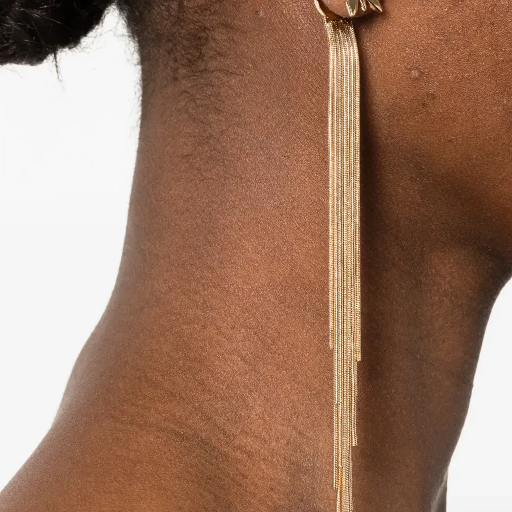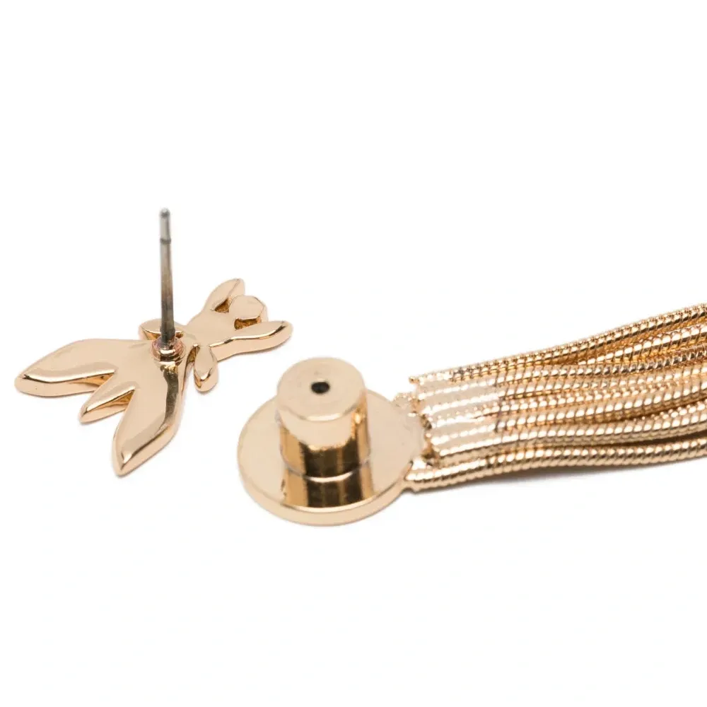 Золотистые серьги с бахромой, застёжка-гвоздик, украшены декоративной деталью в виде мухи. Эти серьги идут в паре.