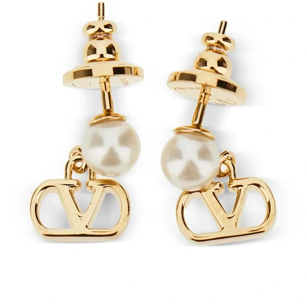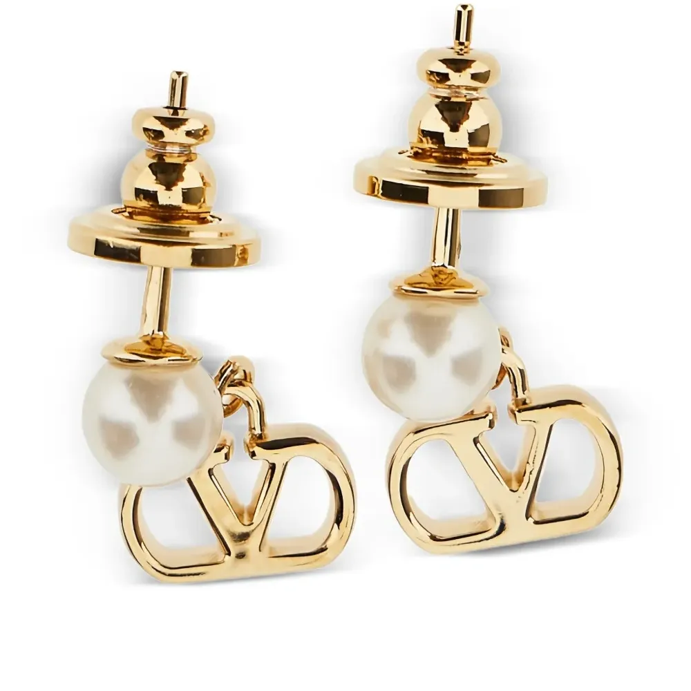 золотистый оттенок, жемчуг цвета крем, дизайн с логотипом, застёжка-гвоздик. Эти серьги идут в паре.