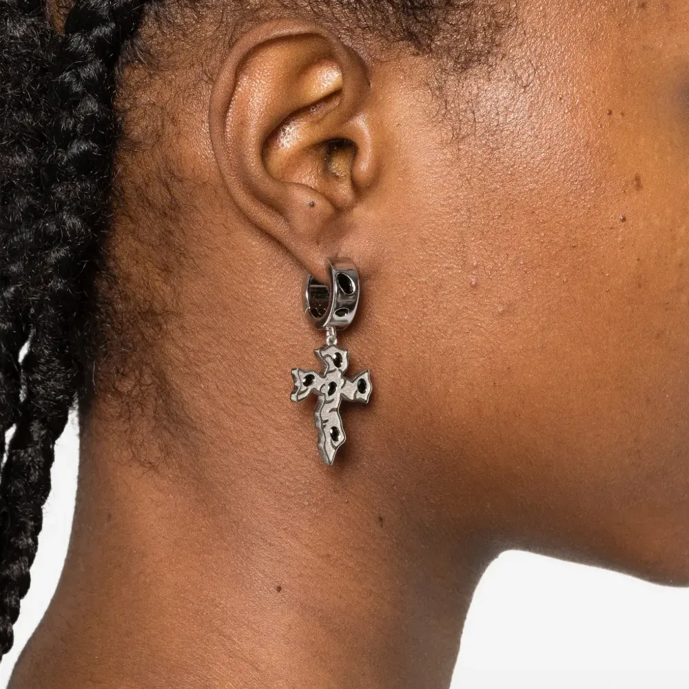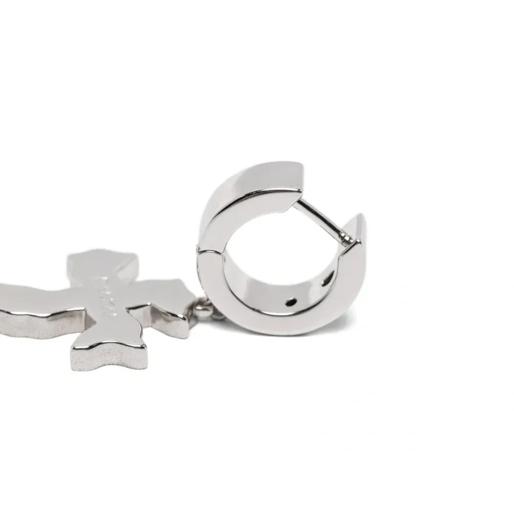 Серьги с крестовидным кулоном серебристого оттенка, застёжка в виде Т-образной планки, дизайн в виде кольца. Эти серьги продаются парой. При повседневном использовании и воздействии внешних факторов блеск драгоценных камней и золотых поверхностей может уменьшаться. Для ухода используйте специальные неабразивные средства, предназначенные для чистки ювелирных изделий.