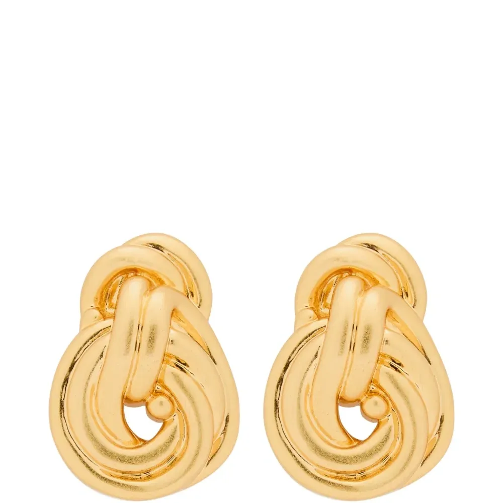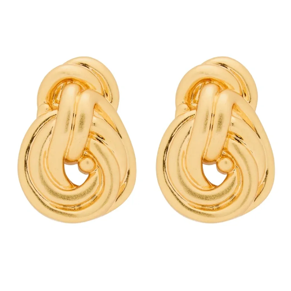 Золотистый оттенок, переплетённый дизайн, круглая форма. Обычное ежедневное использование и воздействие внешних факторов могут уменьшить блеск драгоценных камней и золотых поверхностей. Для ухода используйте специальные неабразивные средства, предназначенные для чистки украшений. Эти серьги продаются в паре.