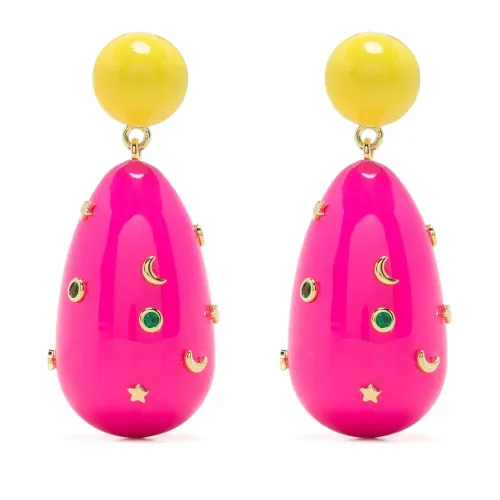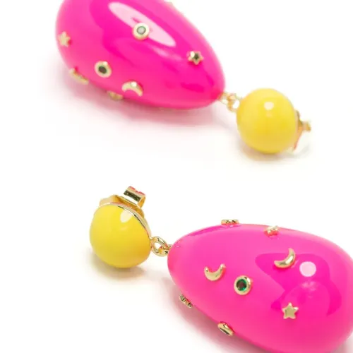 Флуоресцентный розовый, флуоресцентный желтый, заклепки в форме звезд, украшения из горного хрусталя, серьги-подвески, золотистая фурнитура, застежка-штифт и для проколотых ушей. В комплект входят две серьги.