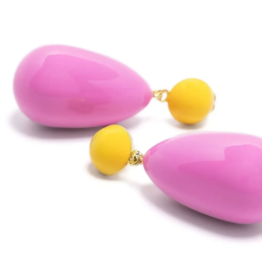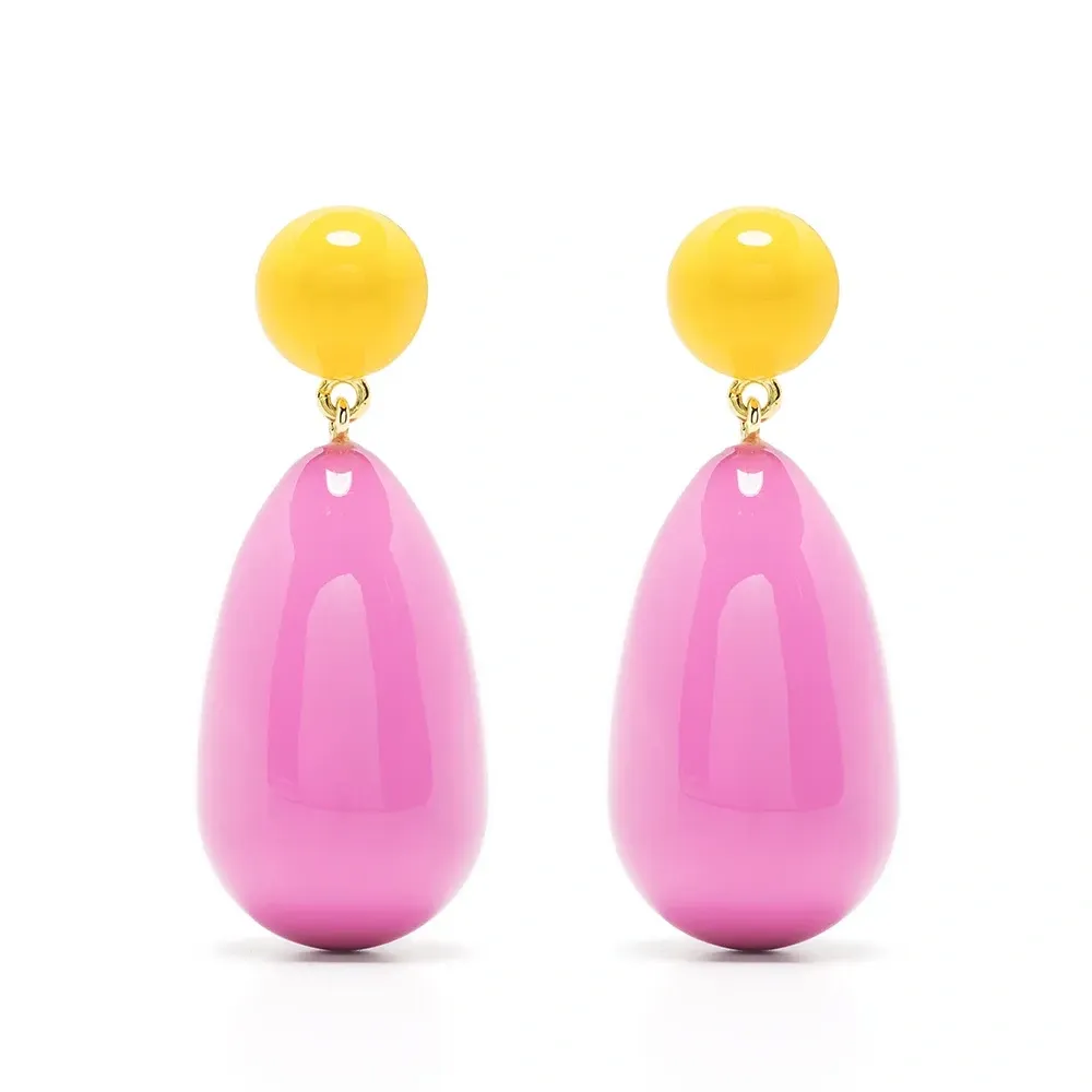 Горчично-желтый, ярко-розовый и деталь из эмали. В комплект входят две серьги.