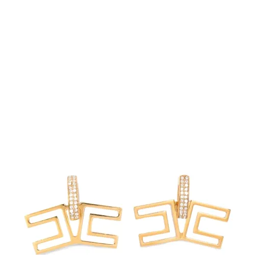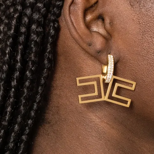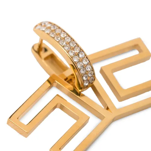 золотые серьги с кристаллами, геометрическим дизайном и подвесками. Эти серьги идут в паре. Обычное ежедневное использование и воздействие внешних факторов могут снизить блеск драгоценных камней и золотых поверхностей. Для ухода используйте специальные неабразивные средства, предназначенные для чистки ювелирных изделий.