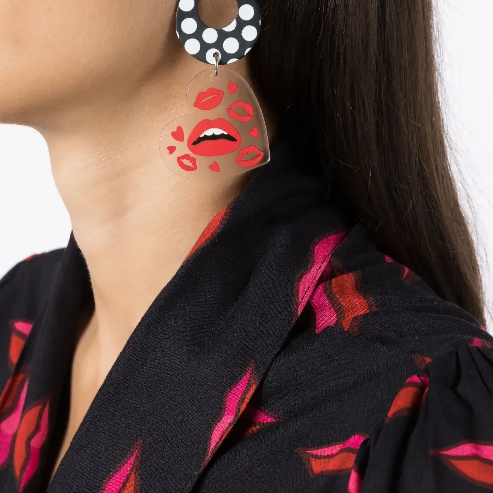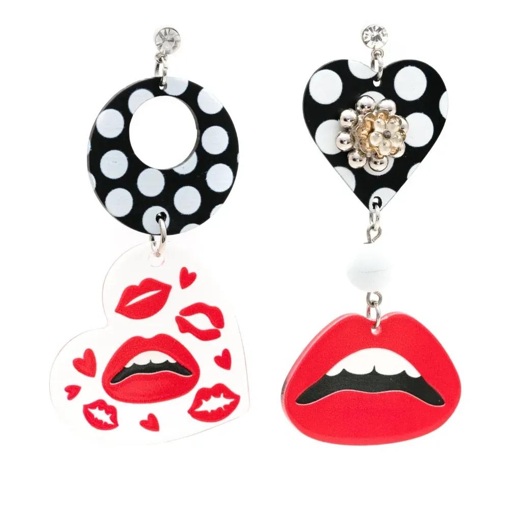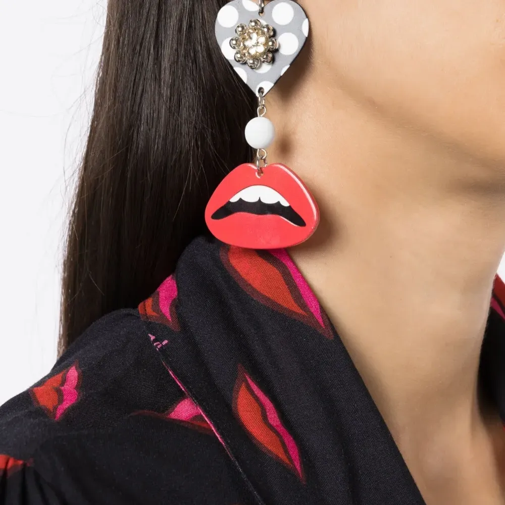 Ярко-красный, разноцветный, узор с изображением губ, асимметричная форма, декор из кристаллов и застежка-бабочка. В комплект входят две серьги.
