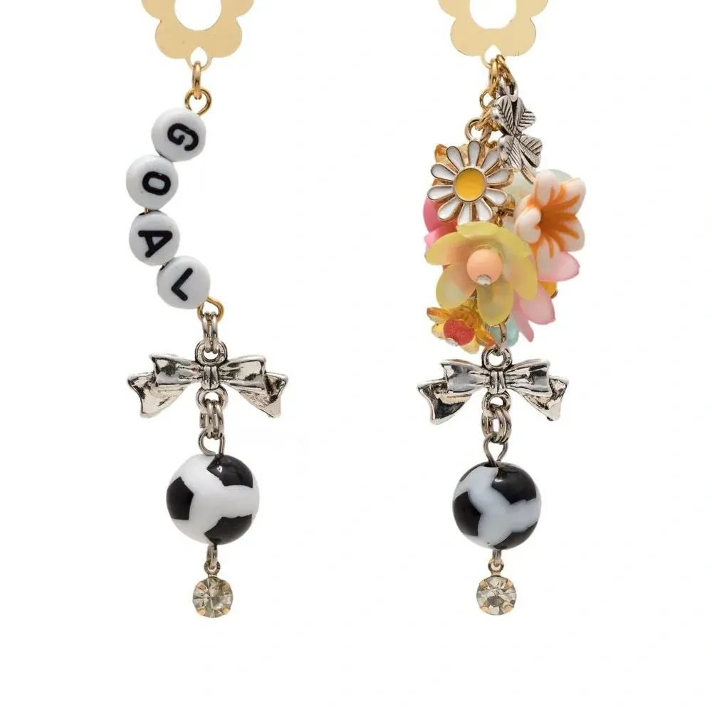Разноцветный, металл, детали из бисера, цветочная аппликация, подвеска с буквой и застежка-бабочка. Правая и левая серьга различаются — это часть дизайна.