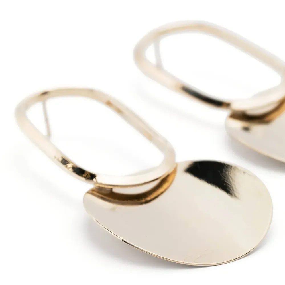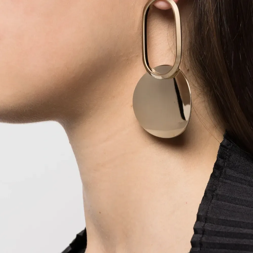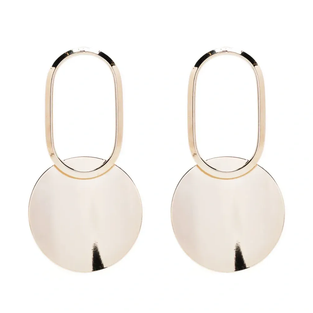 Золотистый, круглая подвеска, кольца среднего размера, глянцевый эффект и застежка-бабочка. В комплект входят две серьги.