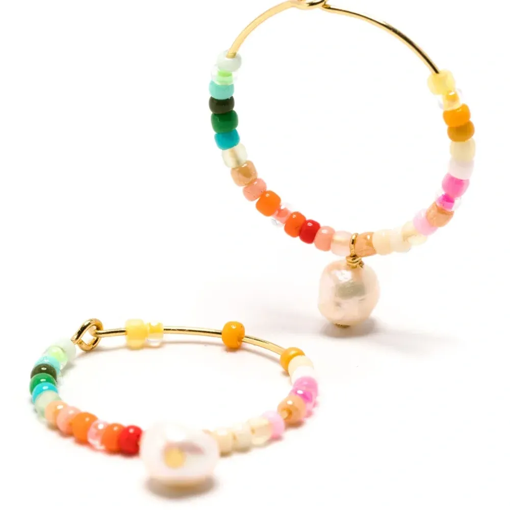 Разноцветный, позолота, пресноводный жемчуг, декор из бисера и кольцо-кликер. Украшения с жемчугом требуют особого ухода и бережного обращения. Избегайте контакта жемчуга с отбеливателями, парфюмом и косметическими средствами. Чтобы почистить изделие с жемчугом, протрите его мягкой тканью. В комплект входят две серьги.