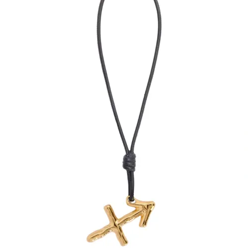 ремешок из черной кожи с золотистым покрытием, кулон золотистого цвета, застежка на ручном узле, гравированное лого, кулон с изображением знака зодиака. Все изделия изготовлены вручную.