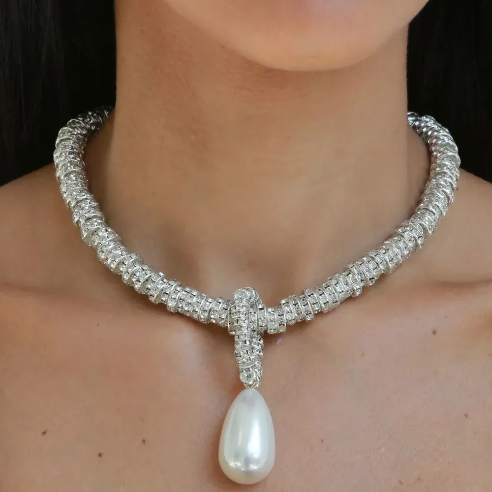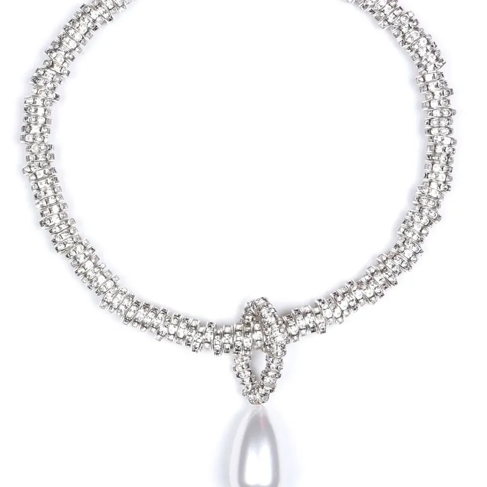 Серебристый, белый, латунь, родиевое покрытие, декор из искусственных кристаллов, жемчужная подвеска, глянцевая фактура и магнитная застежка.