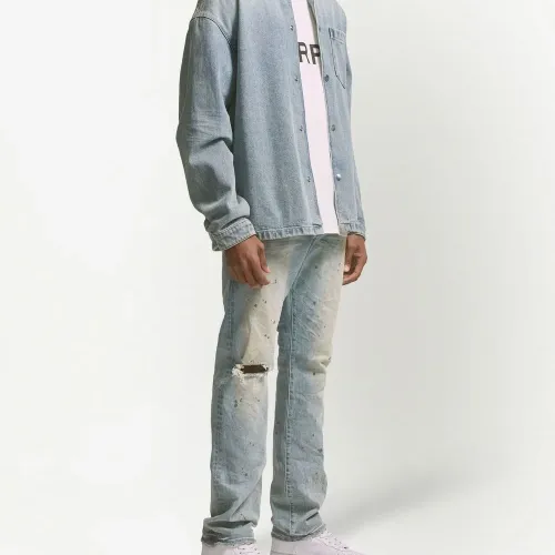 Голубой, деним, обработанный деним, манжеты на пуговицах, приспущенные плечи, классический воротник, застежка на пуговицах спереди, длинные рукава, нагрудный накладной карман и прямой подол.