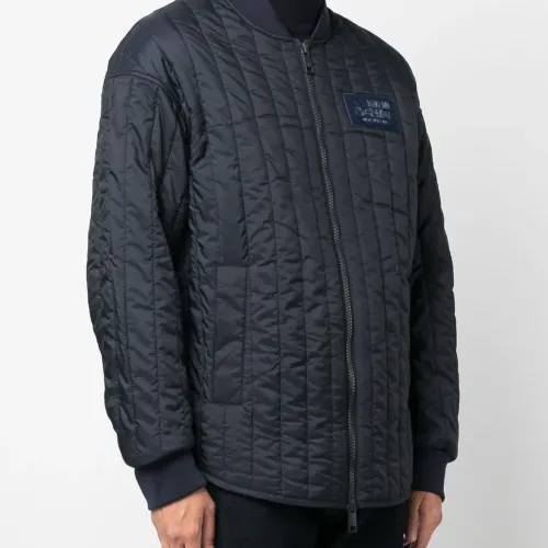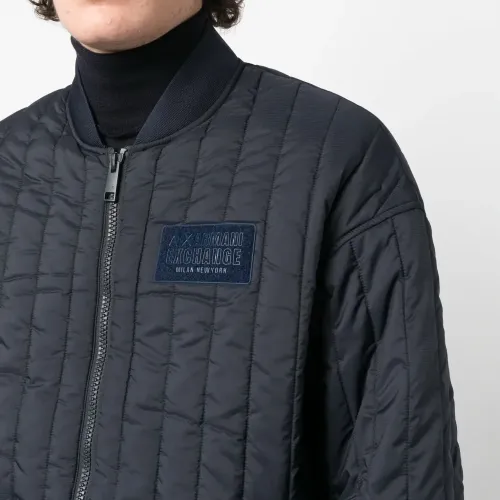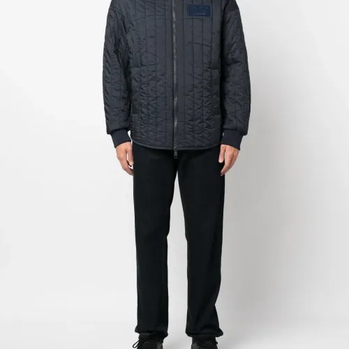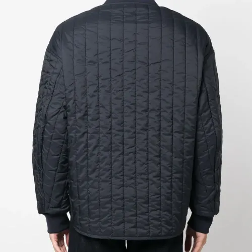 Темно-синий, стеганые вставки, нашивка с логотипом на груди, бейсбольный воротник, двусторонняя молния спереди, приспущенные плечи, длинные рукава, манжеты в рубчик, два боковых кармана с листочкой и закругленный подол.