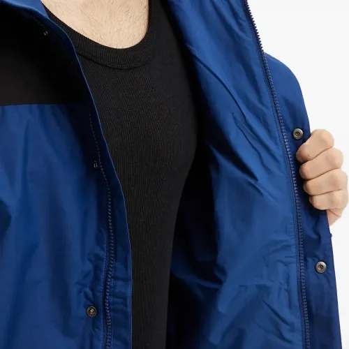синяя куртка с капюшоном, панельным дизайном, застежкой на пуговицы, застежкой-молнией и прорезными карманами