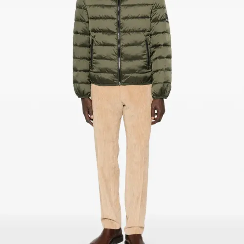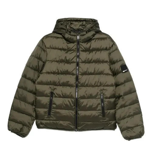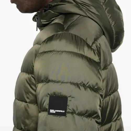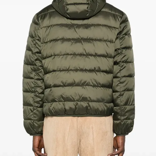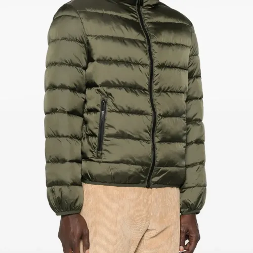темно-зеленый пуховик с нашивкой-логотипом, застежкой-молнией на капюшоне, боковыми карманами на молнии, в стиле "пуховик"