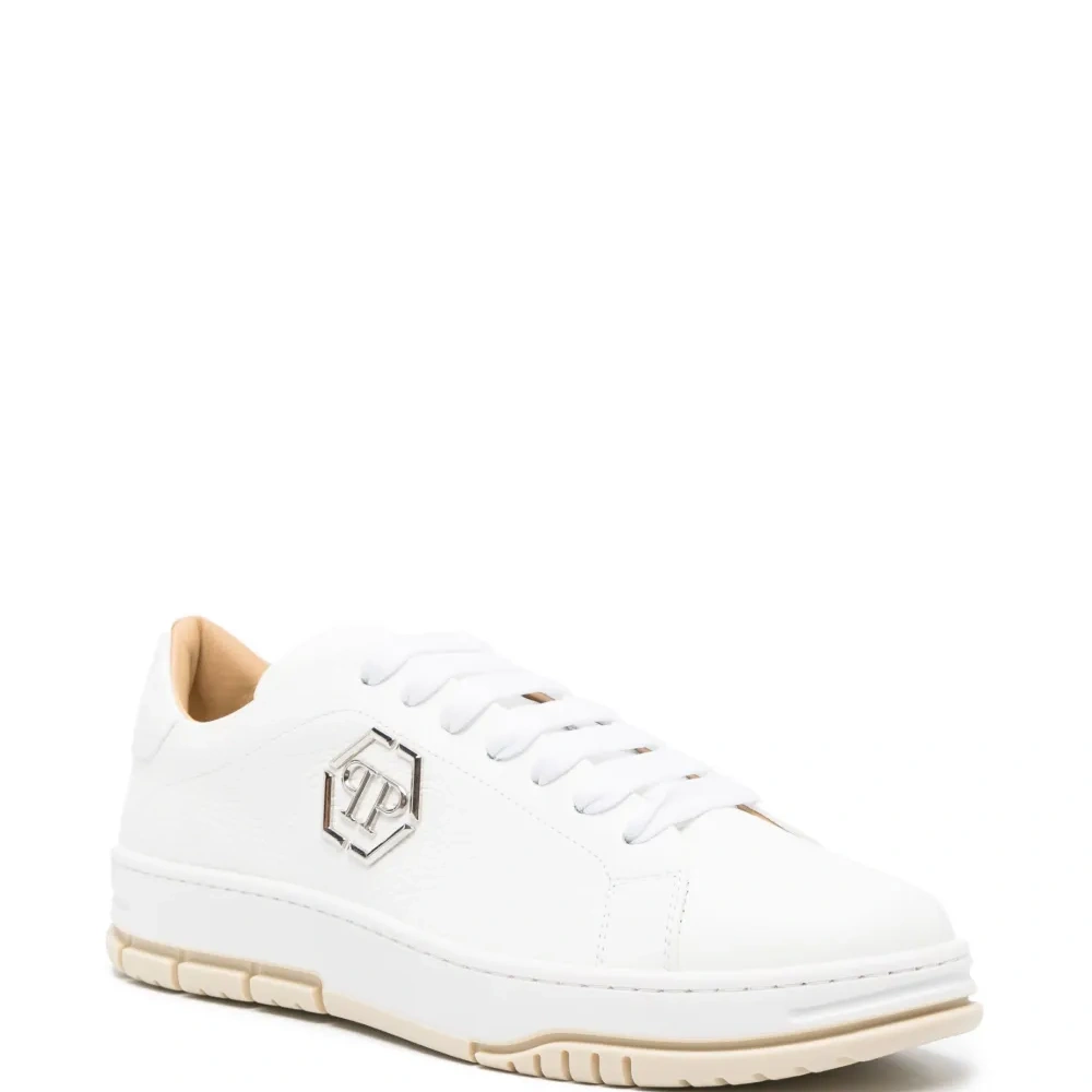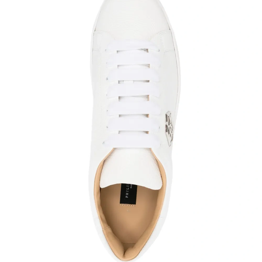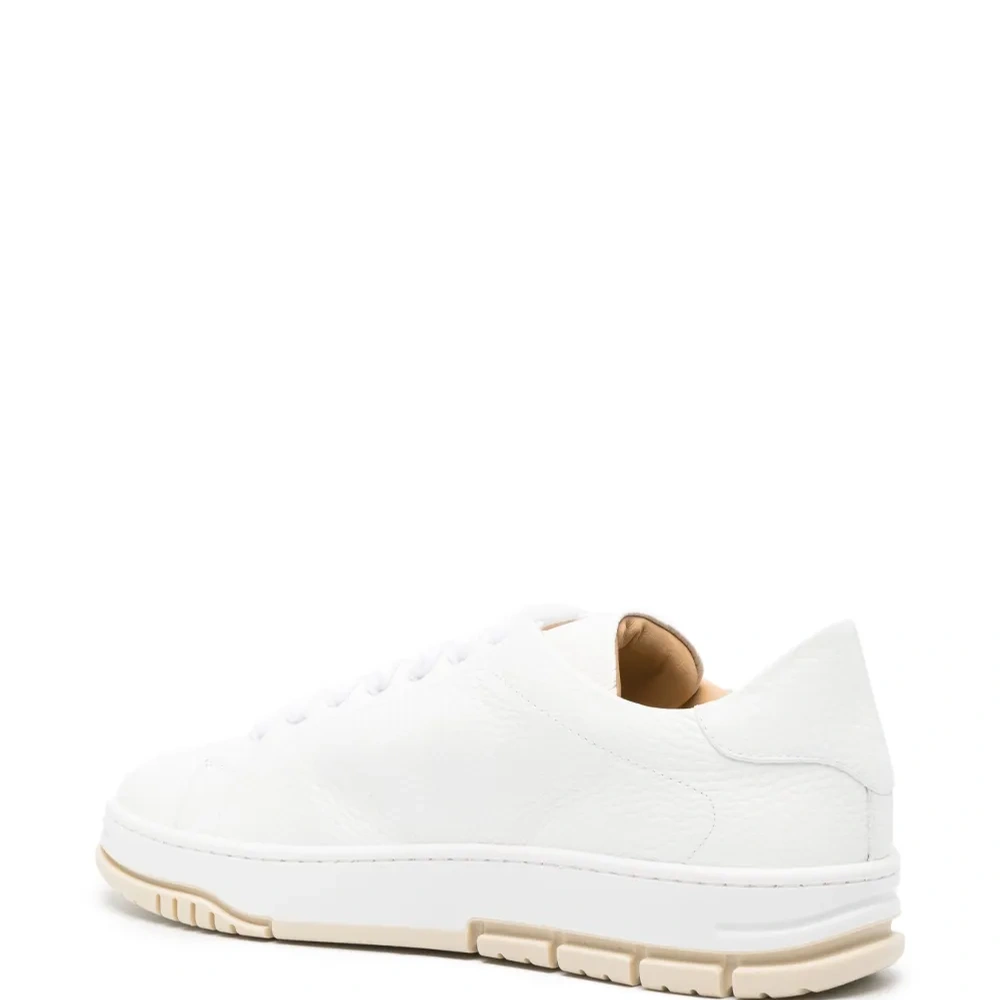 Белый, телячья кожа, зернистая текстура, серебристый металлический логотип, закругленный носок, шнуровка спереди, кожаная стелька с логотипом и плоская резиновая подошва.
