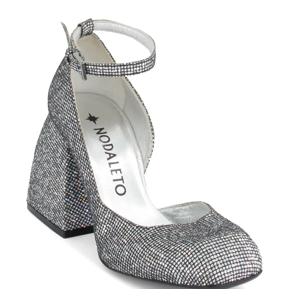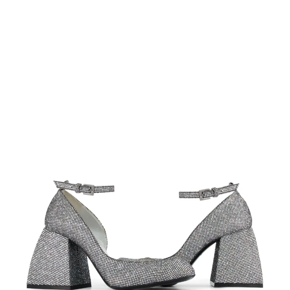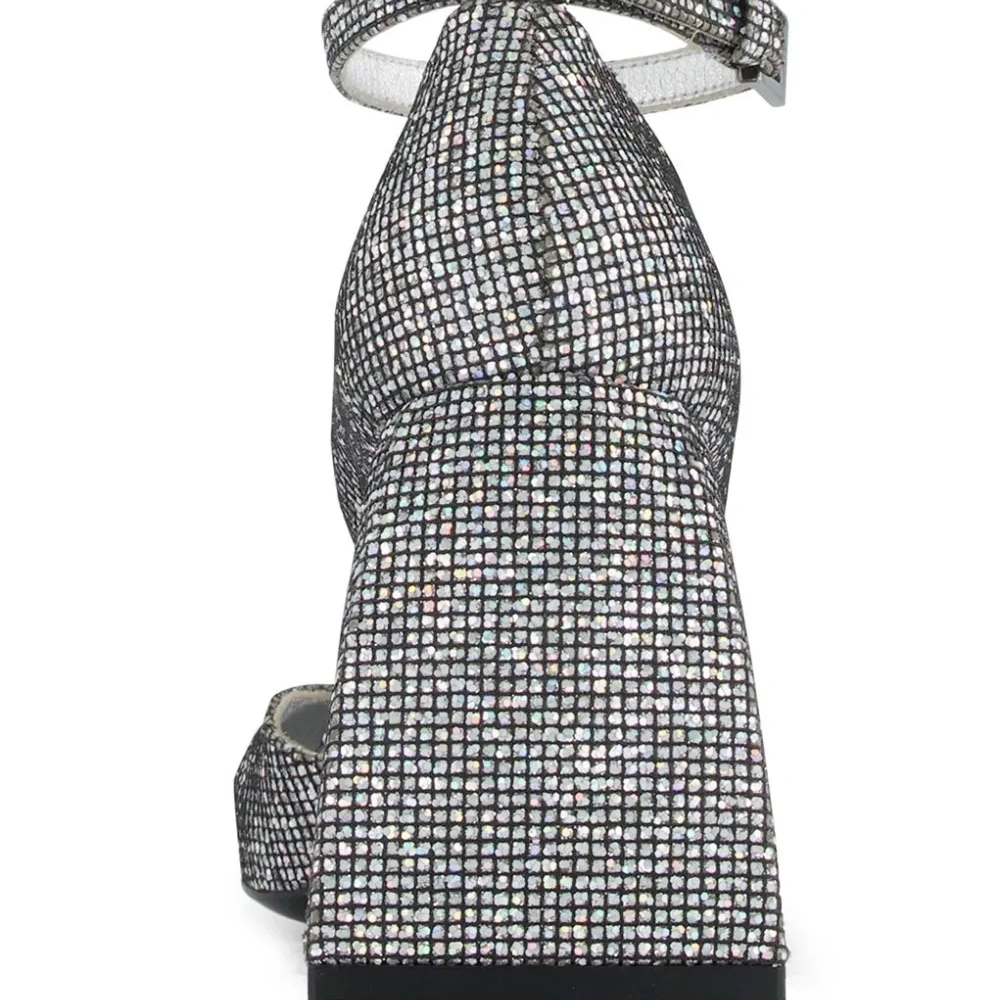 Серебристый, замша, декор из кристаллов, квадратный носок, ремешок на щиколотке с пряжкой и блочный каблук.