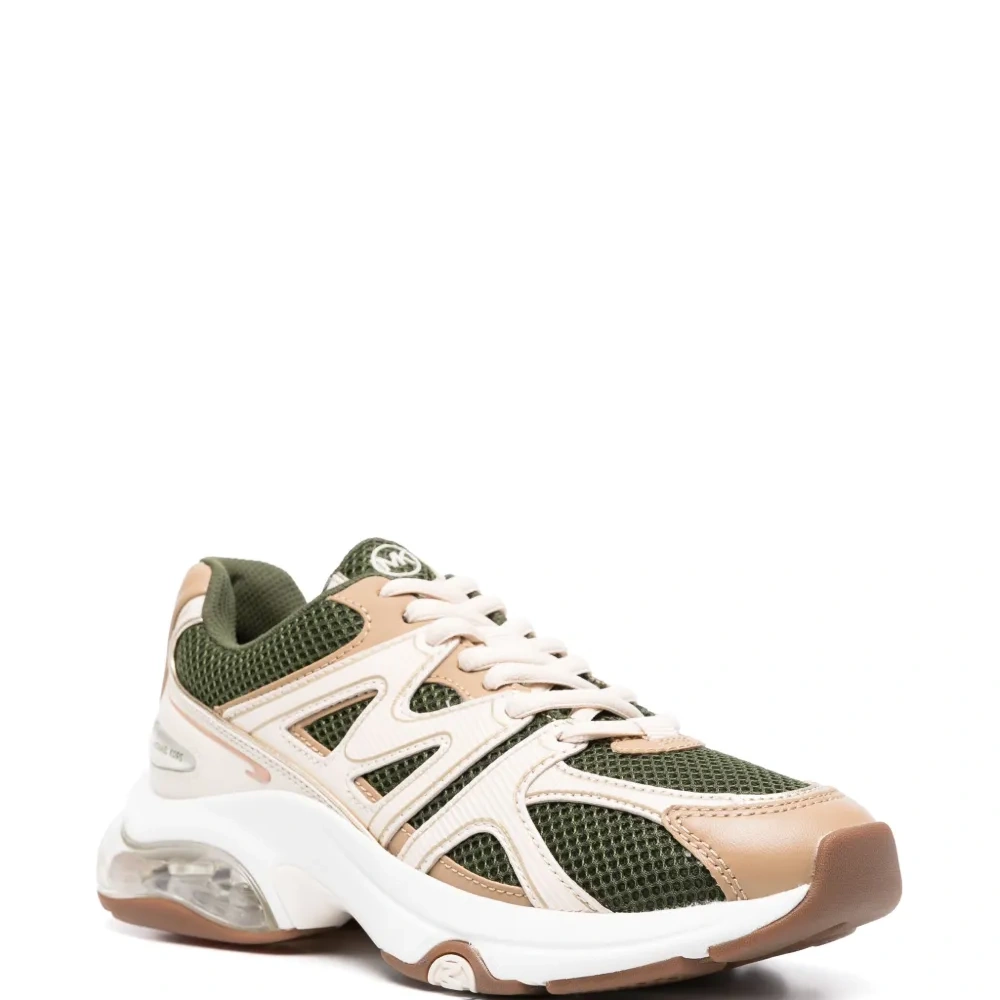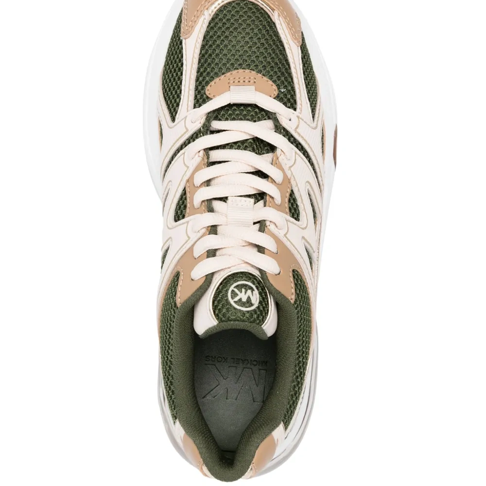 Оливково-зеленый, бежевый, светло-бежевый, телячья кожа, вставки, сетчатые вставки, нашивка с логотипом на язычке, логотип сбоку, закругленный носок, шнуровка спереди, стелька с логотипом и массивная резиновая подошва.