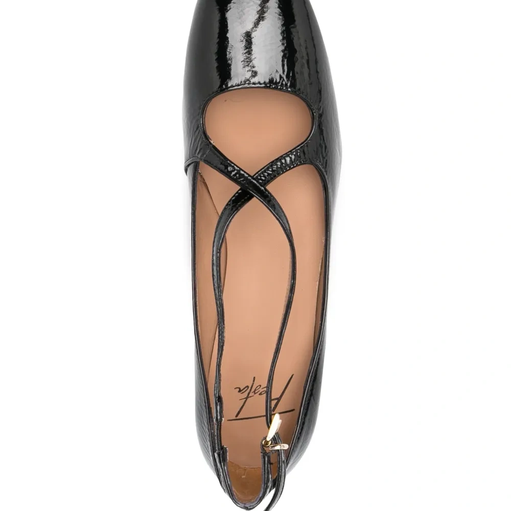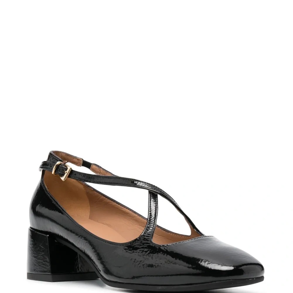 Черный, телячья кожа, стелька с логотипом, перекрестные ремешки, квадратный носок, боковые застежки с пряжками и низкий блочный каблук.