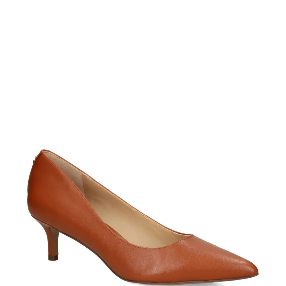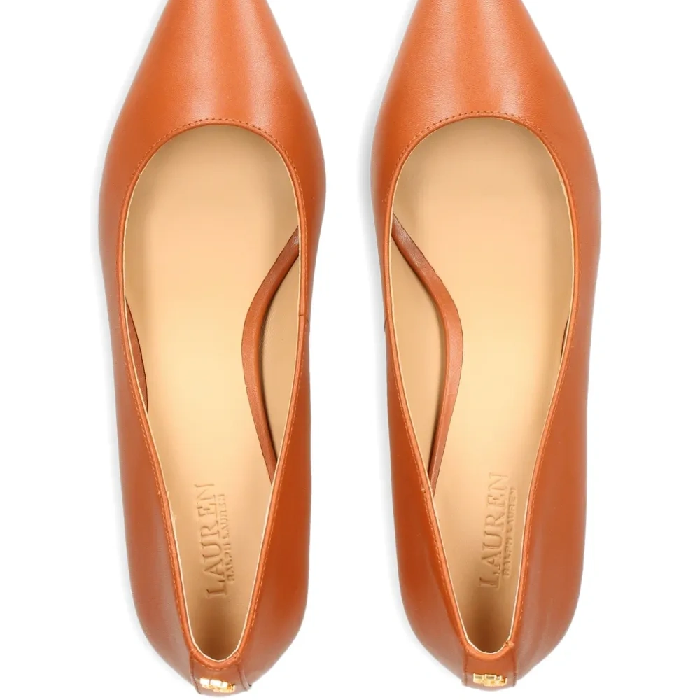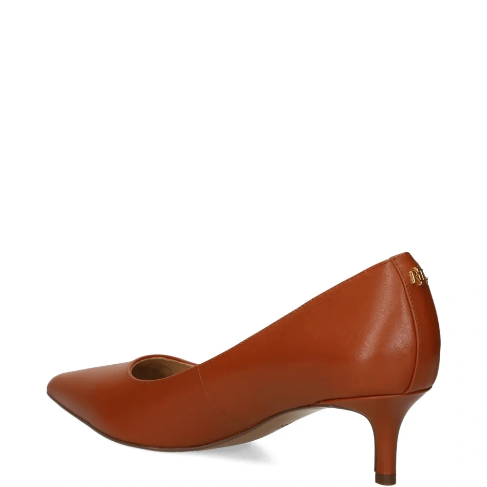 светло-коричневые кожаные туфли с заострённым носком, каблук 50 мм, декор с логотипом золотистого оттенка
