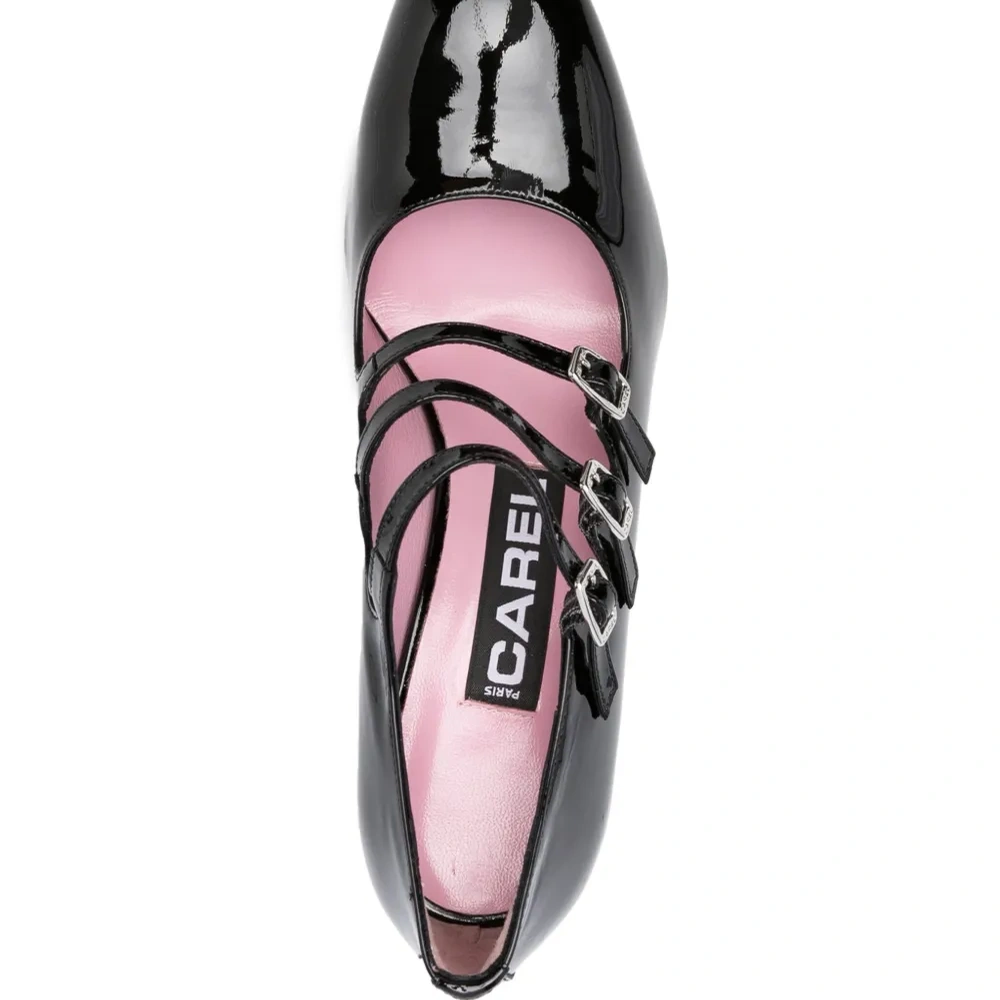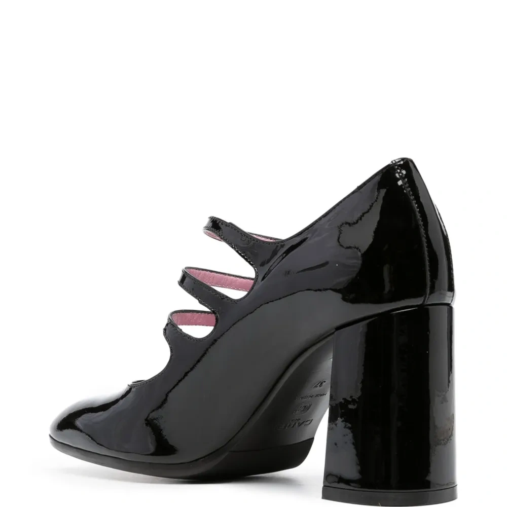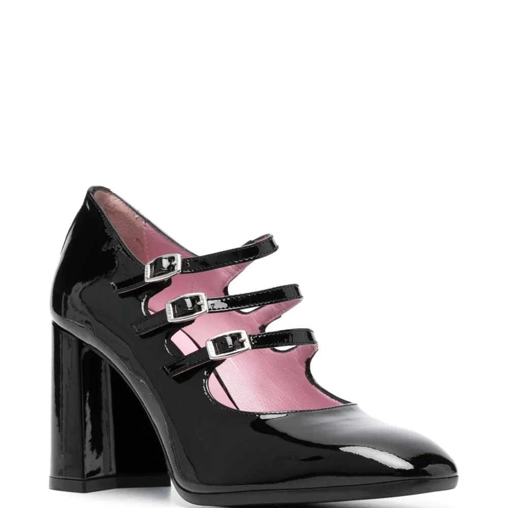 Черный, телячья кожа, лакированная отделка, серебристая фурнитура, миндалевидный носок, застежка на пряжке, кожаная стелька с логотипом, блочный каблук, кожаная подошва и резиновая подошва.