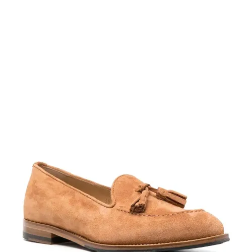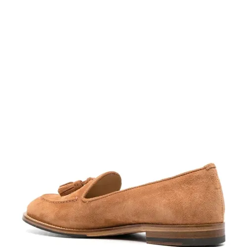 Коричневый, замша, Кожа, миндалевидный носок, декоративные кисточки, стелька с логотипом и плоская резиновая подошва.