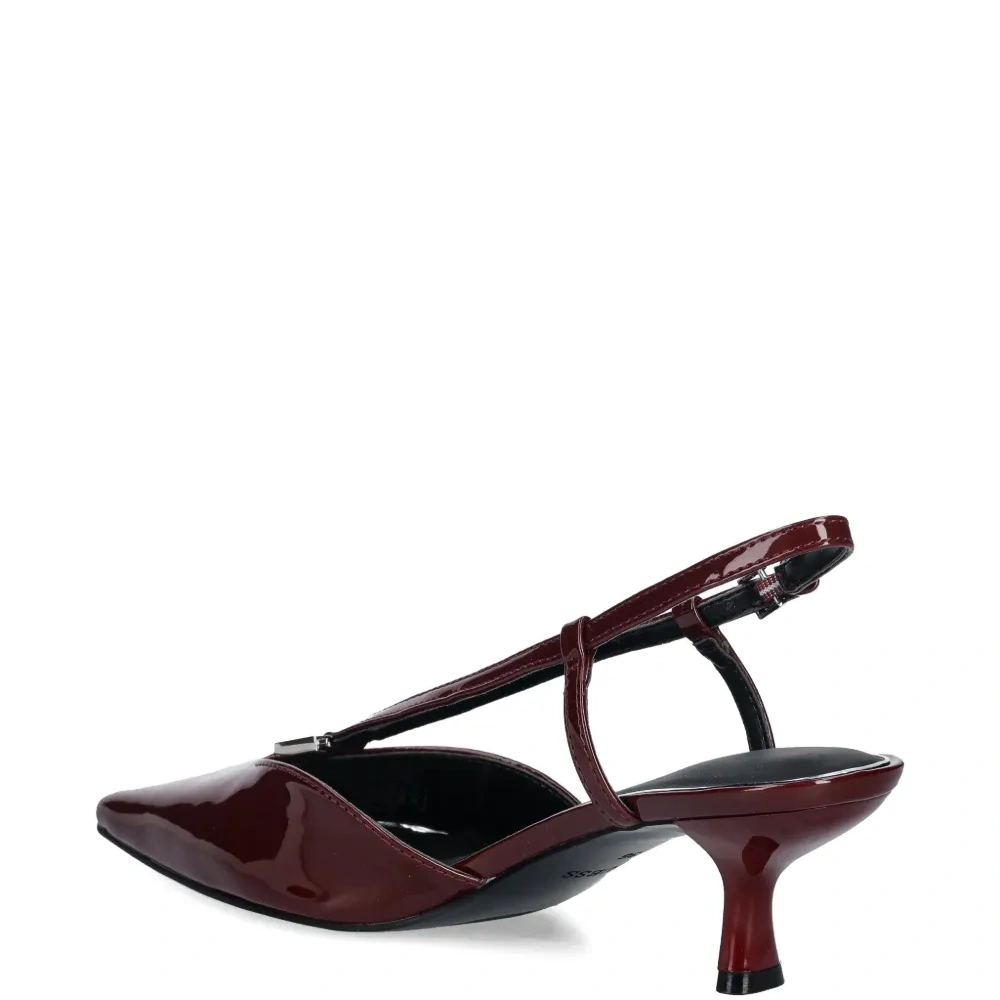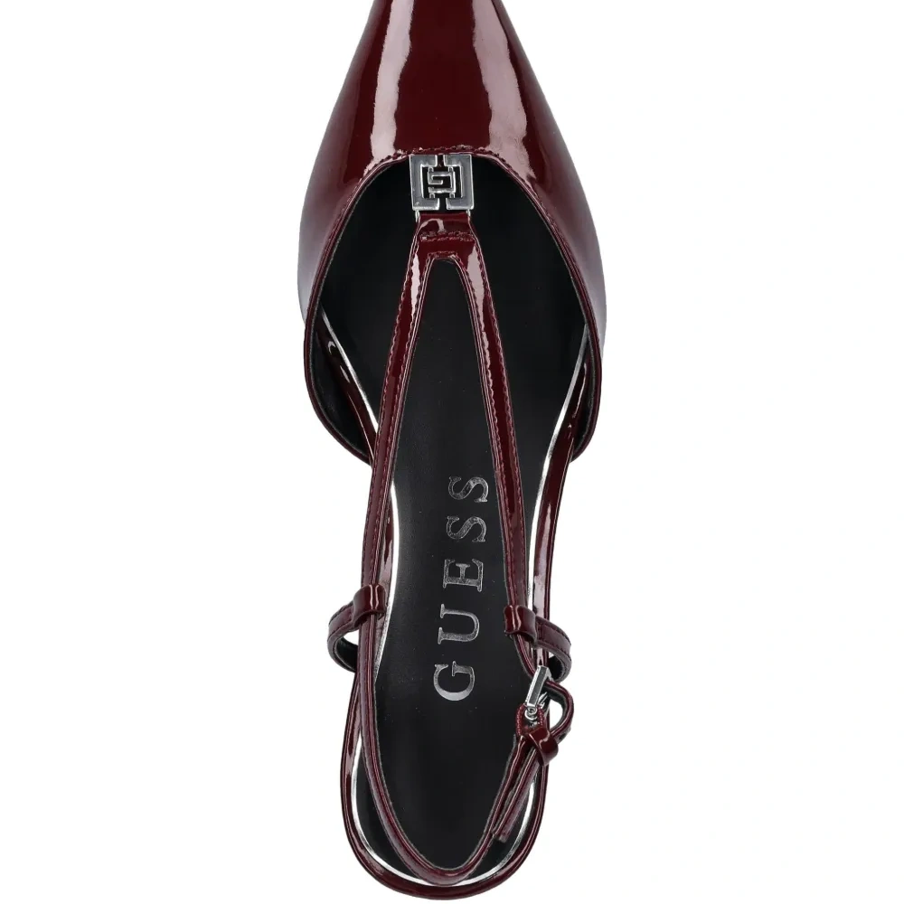 красные туфли с заострённым носком, ремешком, небольшим каблуком, логотипом и застёжкой-пряжкой