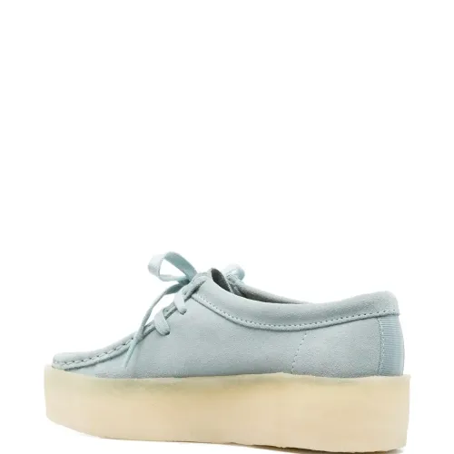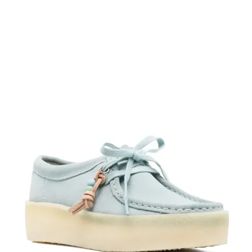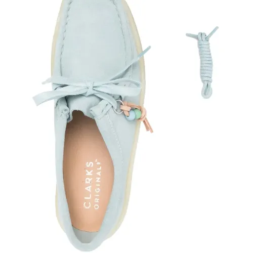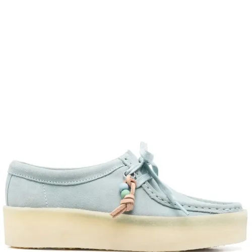 Голубой, замша из телячьей кожи, подвеска с логотипом, швы, шнуровка, миндалевидный носок, кожаная стелька с логотипом и плоская платформа.