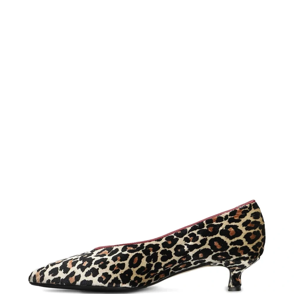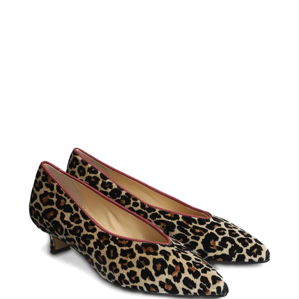коричневые туфли с анималистическим принтом, заострённым носком, на низком каблуке и с красной окантовкой