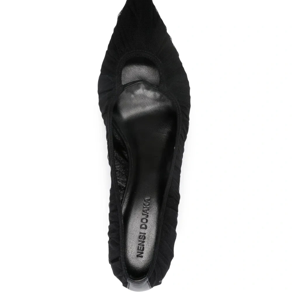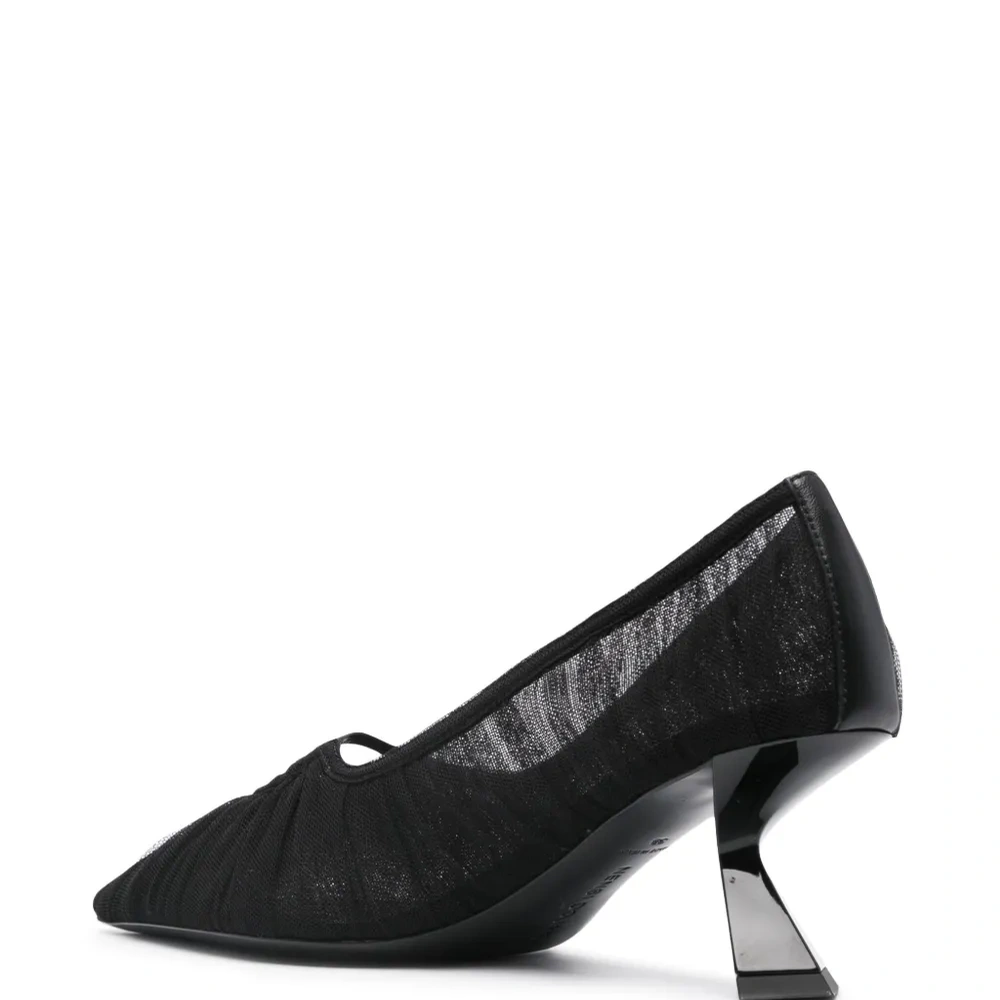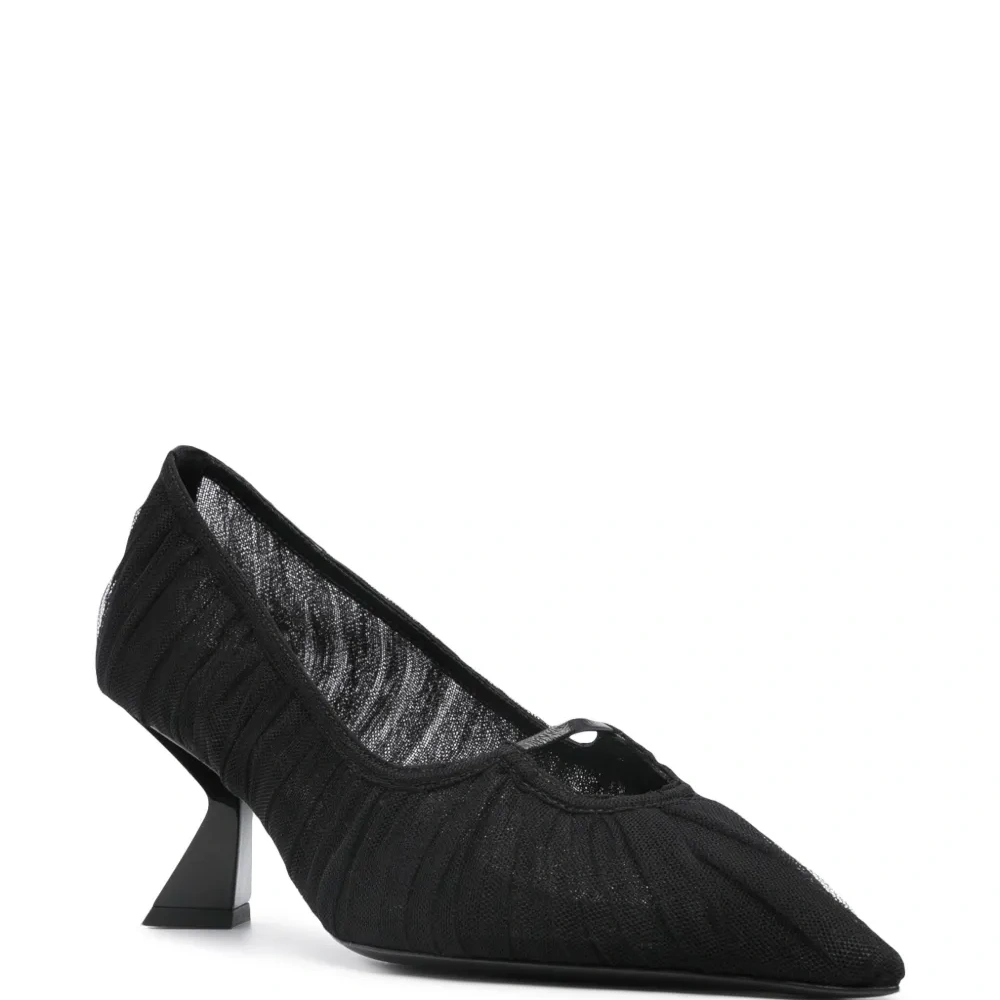 Черный, телячья кожа, заостренный носок, кожаная стелька с логотипом, модель без застежки и скульптурный каблук средней высоты.