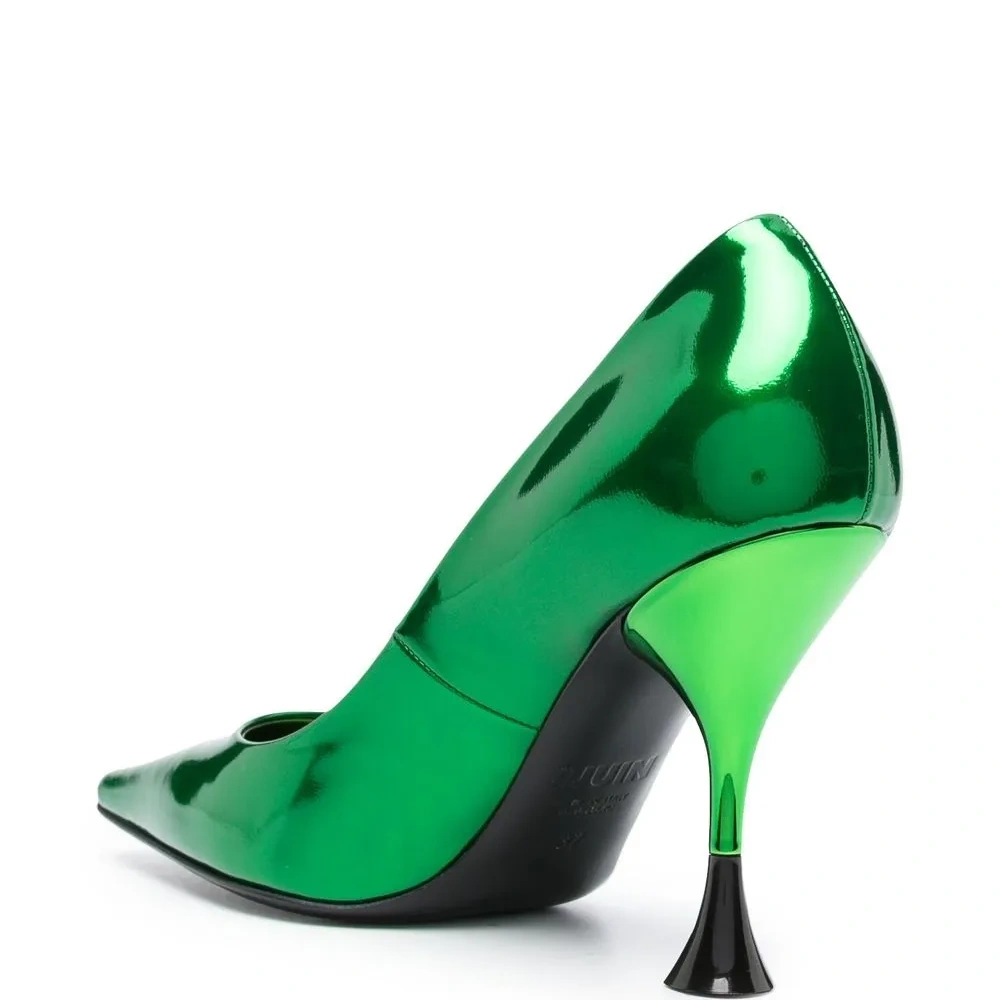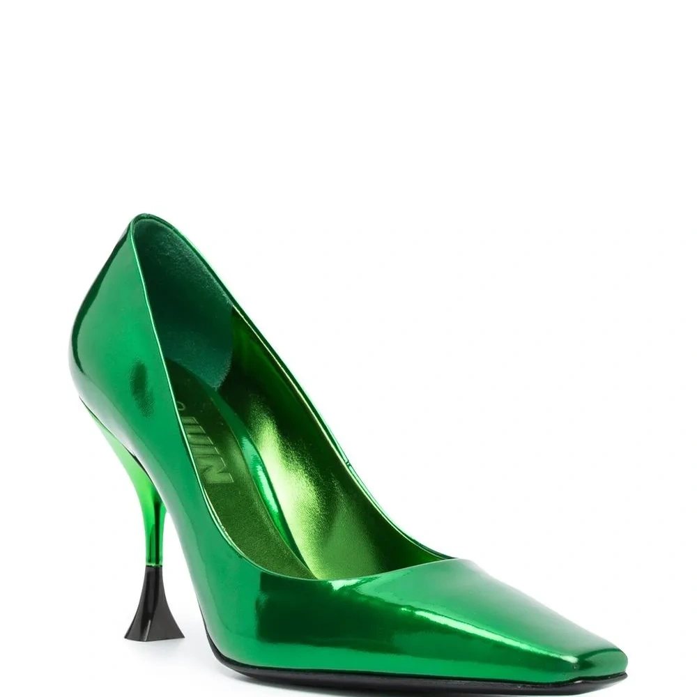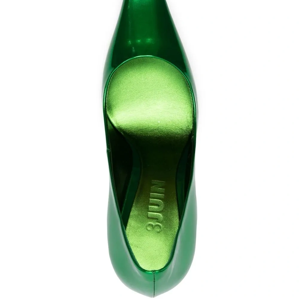 Изумрудно-зеленый, телячья кожа, лакированная отделка, квадратный носок, модель без застежки и каблук на высокой шпильке.