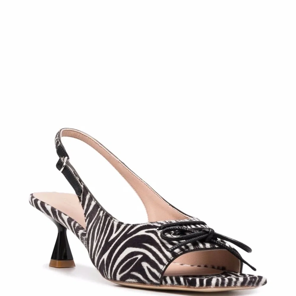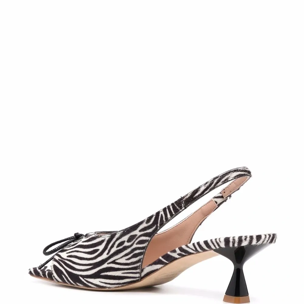 Зебровый принт, шнуровка, открытый носок, ремешок на щиколотке с пряжкой, задник с логотипом и каблук-рюмка.