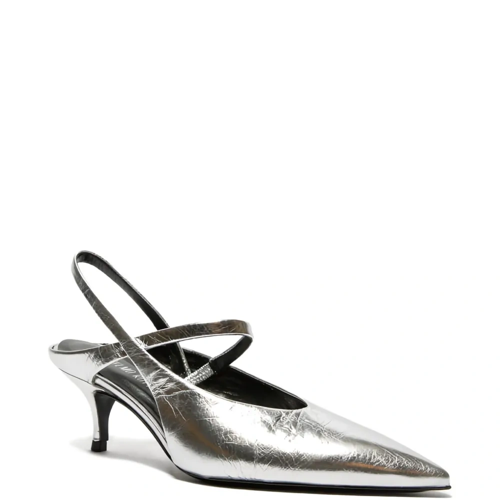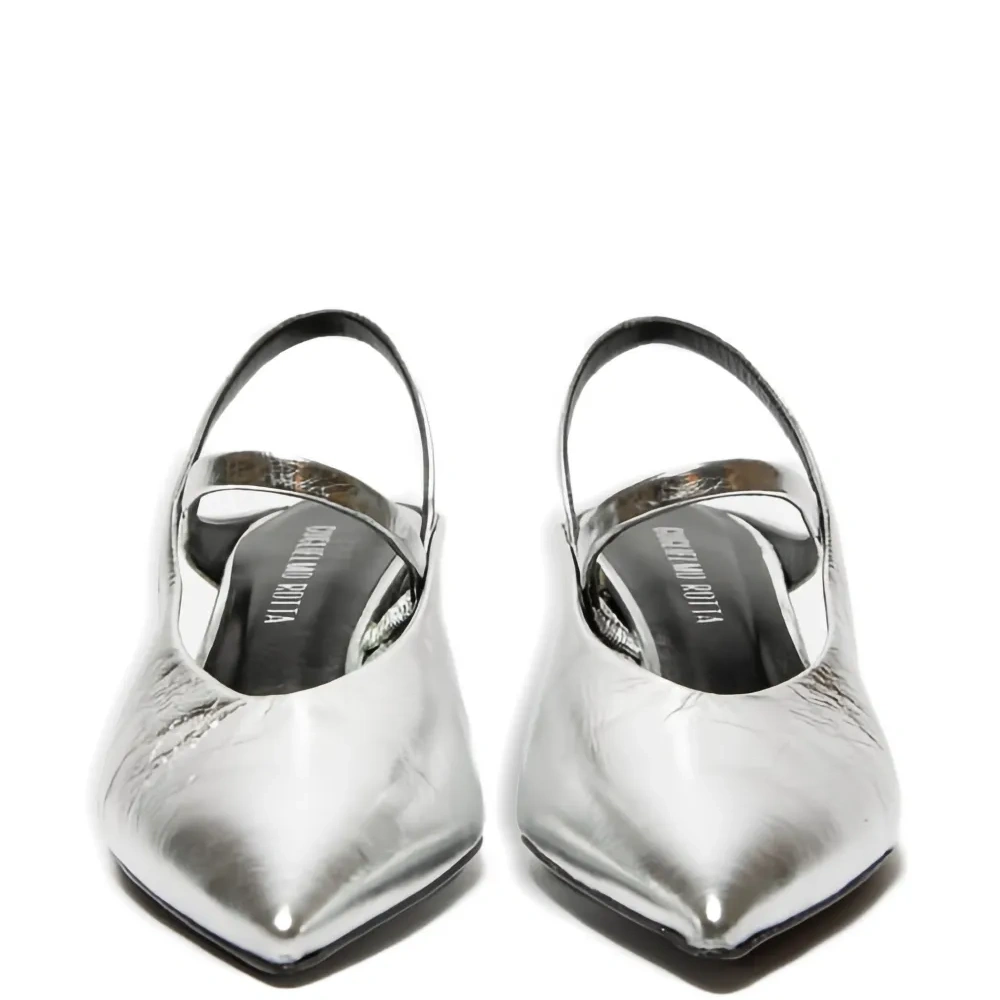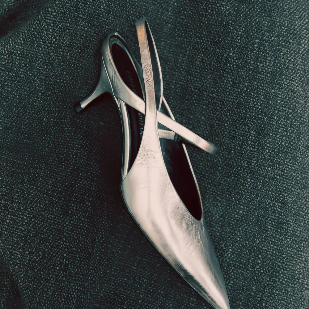 серебристые туфли с заострённым мысом, ремешком на пятке, невысоким каблуком и перекрещивающимися ремешками