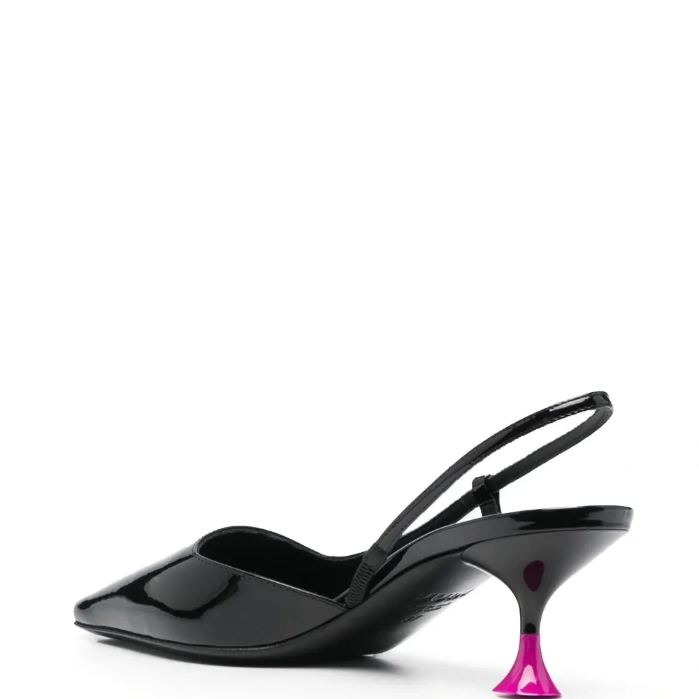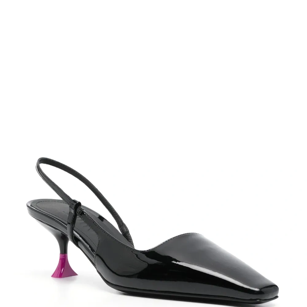 Черный, телячья кожа, лакированная отделка, квадратный носок, эластичный ремешок на пятке, модель без застежки и низкий скульптурный каблук.