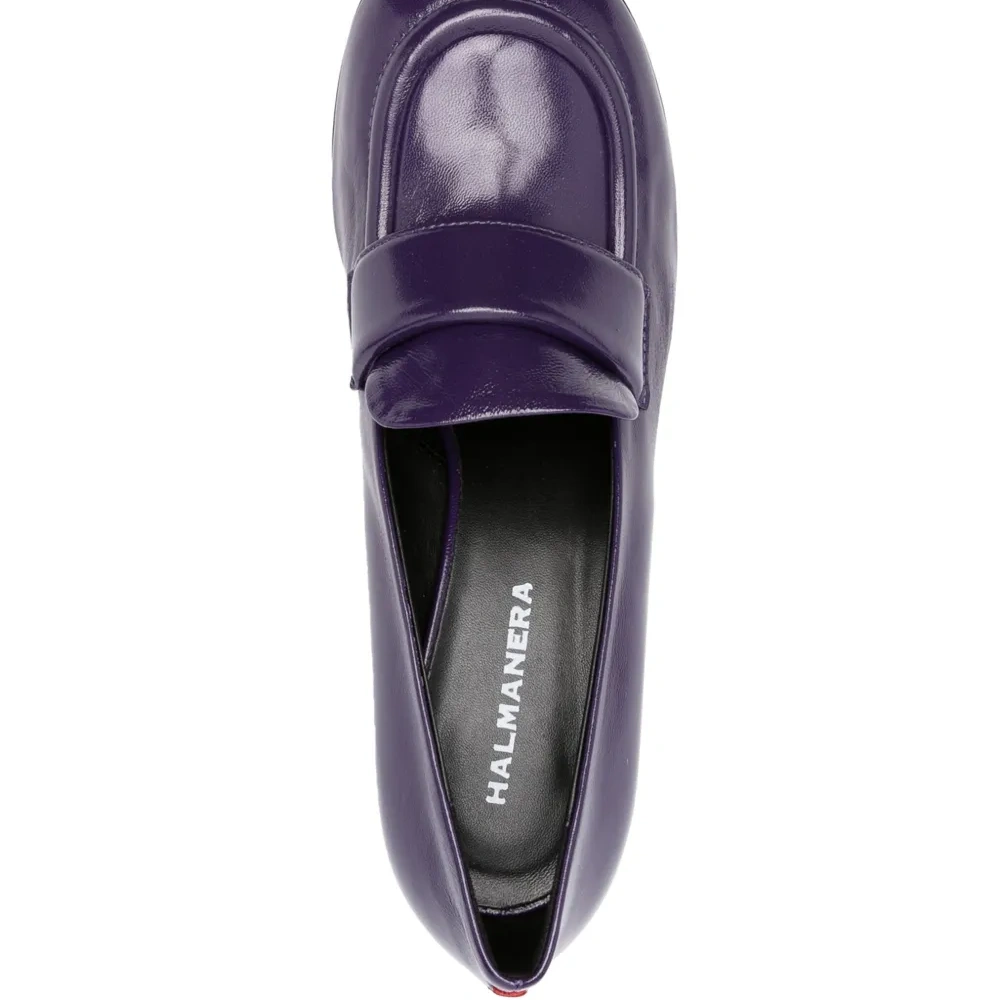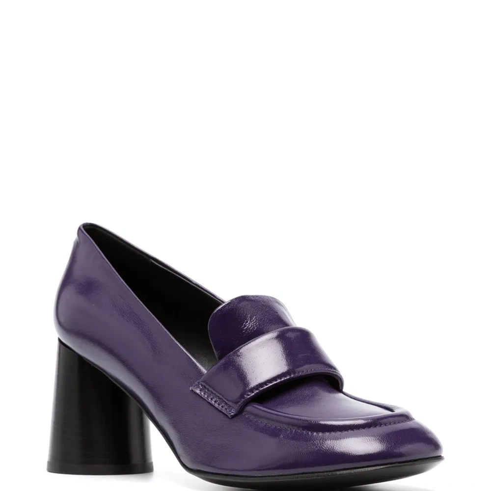 Темно-фиолетовый, телячья кожа, модель без застежки, закругленный носок, стелька с логотипом и высокий блочный каблук.