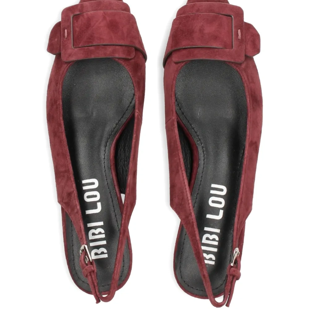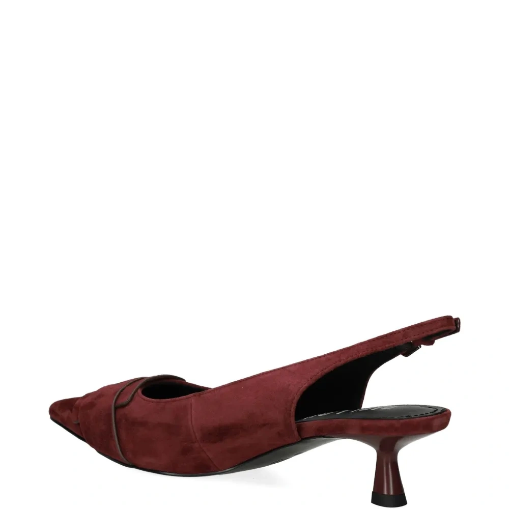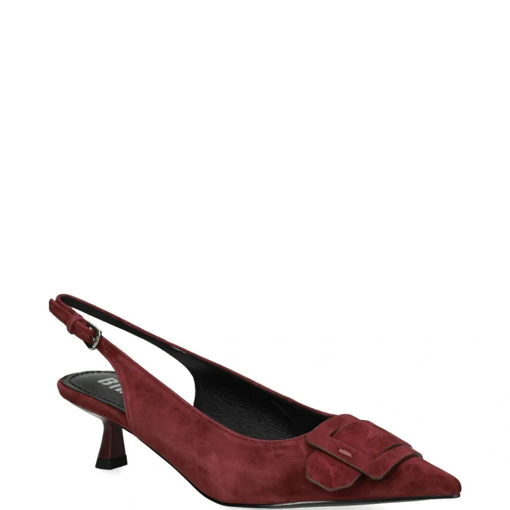 бордовые замшевые туфли с заострённым носком, пряжкой, ремешком на пятке и низким каблуком-«рюмочка»