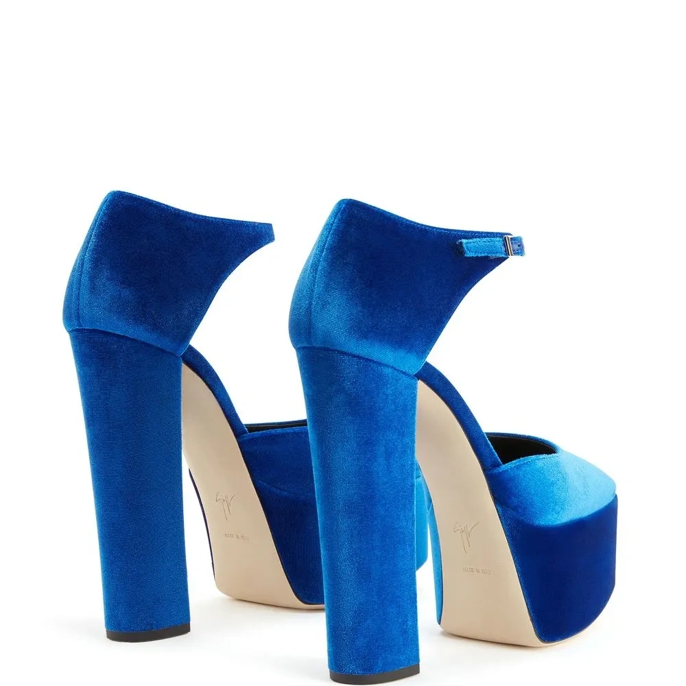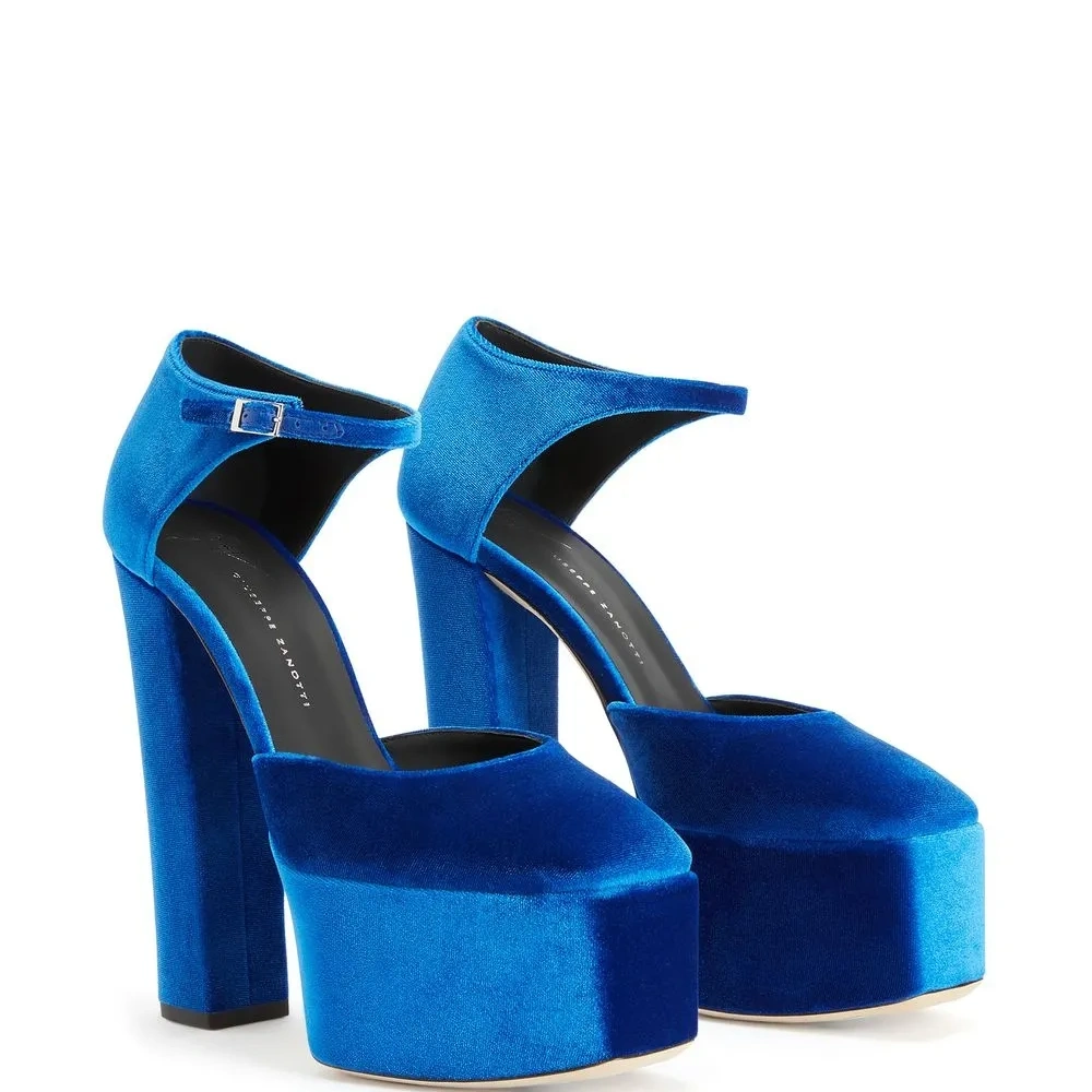 Синий, кожа, бархатный эффект, квадратный носок, стелька с логотипом, ремешок на щиколотке с пряжкой, стелька с логотипом и подошва на платформе.